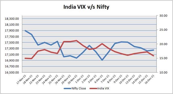 Nifty December 2021 futures closed at 17340.05 (LTP) on Thursday, at a premium of 91.65 points over spot closing of 17248.40, while Nifty January 2022 futures ended at 17400.00 (LTP), at a premium of 151.60 points over spot closing. Nifty December futures saw a contraction of 12,015 units, taking the total outstanding open interest (OI) to 2,27,721 units. The near month derivatives contract will expire on December 30, 2021 (Provisional).