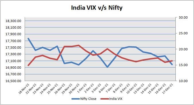 India Volatility Index (VIX), a gauge for market’s short-term expectation of volatility increased by 2.78% and reached 16.34. The 50 share Nifty down by 263.20 points or 1.53% to settle at 16,985.20.