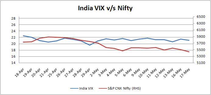 The India VIX was down by 2.00% to 21.03 on Tuesday compared to its previous close of 21.46 on Monday.