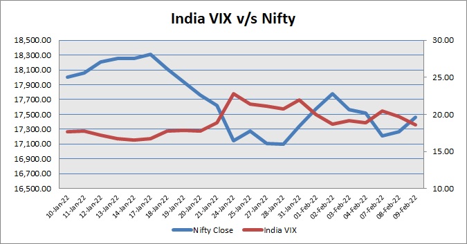 Nifty February 2022 futures closed at 17487.00 (LTP) on Wednesday, at a premium of 23.20 points over spot closing of 17463.80, while Nifty March 2022 futures ended at 17548.95 (LTP), at a premium of 85.15 points over spot closing. Nifty February futures saw an addition of 576 units, taking the total open interest (Contracts) to 1,88,498 units. The near month derivatives contract will expire on February 24, 2022 (Provisional).