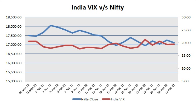 Nifty May 2022 futures closed at 17133.00 (LTP) on Friday, at a premium of 30.45 points over spot closing of 17102.55, while Nifty June 2022 futures ended at 17157.45 (LTP), at a premium of 54.90 points over spot closing. Nifty May futures saw an addition of 14,372 units, taking the total open interest (contracts) to 1,84,680 units. The near month derivatives contract will expire on May 26, 2022 (Provisional).