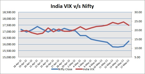 India Volatility Index (VIX), a gauge for market’s short-term expectation of volatility decreased by 7.27% and reached 22.74. The 50 share Nifty up by 417.00 points or 2.63% to settle at 16,259.30.