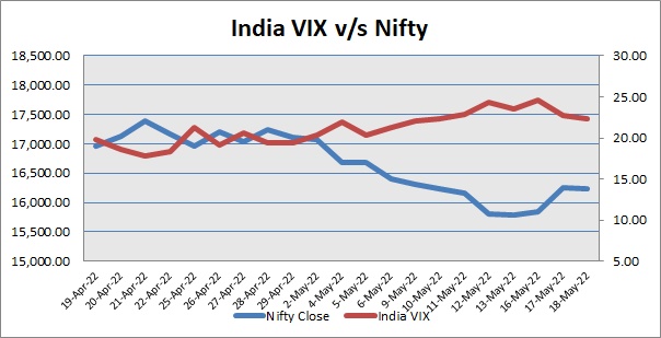 Nifty May 2022 futures closed at 16237.00 (LTP) on Wednesday, at a discount of 3.30 points over spot closing of 16240.30, while Nifty June 2022 futures ended at 16247.60 (LTP), at a premium of 7.30 points over spot closing. Nifty May futures saw a contraction of 5,175 units, taking the total open interest (contracts) to 1,71,383 units. The near month derivatives contract will expire on May 26, 2022 (Provisional).