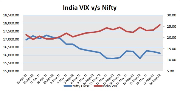 India Volatility Index (VIX), a gauge for market’s short-term expectation of volatility increased by 9.56% and reached 25.64. The 50 share Nifty down by 89.55 points or 0.55% to settle at 16,125.15.