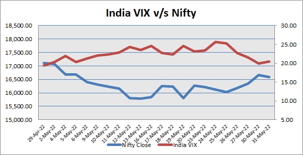 India Volatility Index (VIX), a gauge for market’s short-term expectation of volatility increased by 2.48% and reached 20.48. The 50 share Nifty down by 76.85 points or 0.46% to settle at 16,584.55.