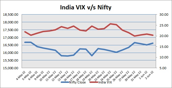 India Volatility Index (VIX), a gauge for market’s short-term expectation of volatility decreased by 2.51% and reached 20.32. The 50 share Nifty up by 105.25 points or 0.64% to settle at 16,628.00.