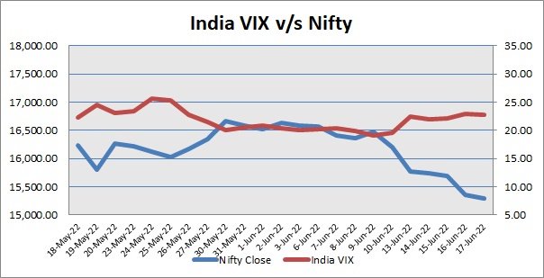 Nifty June 2022 futures closed at 15348.80 (LTP) on Friday, at a premium of 55.30 points over spot closing of 15293.50, while Nifty July 2022 futures ended at 15370.00 (LTP), at a premium of 76.50 points over spot closing. Nifty June futures saw an addition of 8,817 units, taking the total open interest to 2,29,173 units. The near month derivatives contract will expire on June 30, 2022 (Provisional).