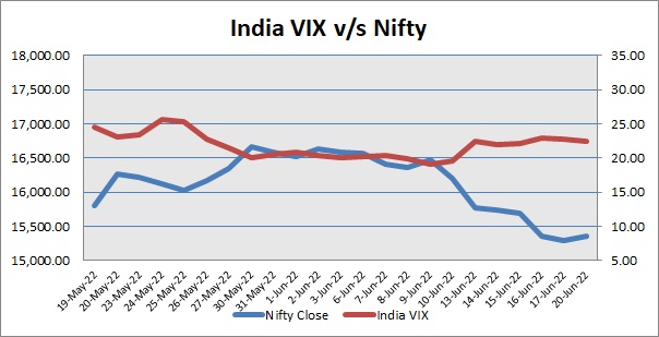 Nifty June 2022 futures closed at 15366.00 on Monday, at a premium of 15.85 points over spot closing of 15350.15, while Nifty July 2022 futures ended at 15385.50, at a premium of 35.35 points over spot closing. Nifty June futures saw an addition of 3,347 units, taking the total outstanding open interest (OI) to 2,17,026 units. The near month derivatives contract will expire on June 30, 2022 (Provisional).