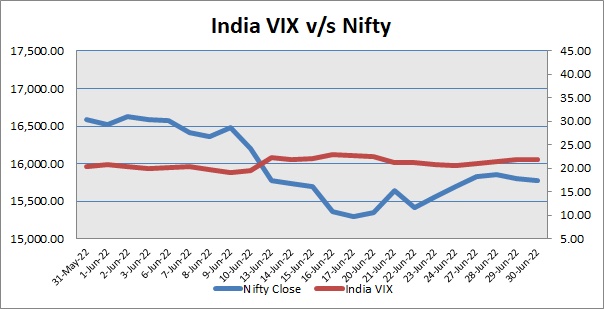 India Volatility Index (VIX), a gauge for market’s short-term expectation of volatility decreased by 0.27% and reached 21.84. The 50 share Nifty down by 18.85 points or 0.12% to settle at 15,780.25.