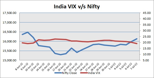 Nifty July 2022 futures closed at 16161.00 (LTP) on Thursday, at a premium of 28.10 points over spot closing of 16132.90, while Nifty August 2022 futures ended at 16181.00 (LTP), at a premium of 48.10 points over spot closing. Nifty July futures saw a contraction of 3,276 units, taking the total open interest (OI) to 2,46,402 units. The near month derivatives contract will expire on July 28, 2022 (Provisional).