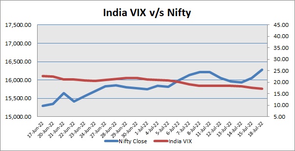 Nifty finished Monday’s session above 16250 mark. India VIX was down by 2.48%. Market made a positive start, as SBI Research in its latest report has said that the income of farmers has grown in the range of 1.3-1.7 times in FY22 from the FY18 levels on average while grain exports soared to over USD 50 billion. For certain crops in some states (like soyabean in Maharashtra and cotton in Karnataka) farmers' income more than doubled in FY22 from FY18 levels. Further, index continued its range bound trade after the Reserve Bank of India in its latest monthly bulletin said that the Indian economy remains resilient despite formidable global headwinds and amidst fears of a recession. The bulletin said that in spite of geopolitical spillovers, 'There are sparks in the wind that ignite the innate strength of the economy and set it on course to becoming the fastest growing economy in the world, though besieged it might be by fears of recession'. Traders ignored report that country’s foreign exchange reserves declined by a massive $8.062 billion to $580.252 billion in the week ended July 8, 2022. Market continued its strength to strength trade and closed the day’s trade with the gains of over a percent.