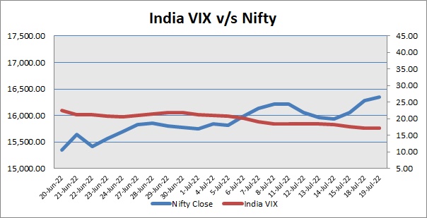 Nifty July 2022 futures closed at 16338.00 (LTP) on Tuesday, at a discount of 2.55 points over spot closing of 16340.55, while Nifty August 2022 futures ended at 16353.70 (LTP), at a premium of 13.15 points over spot closing. Nifty July futures saw an addition of 6,671 units, taking the total open interest (Contracts) to 2,25,121 units. The near month derivatives contract will expire on July 28, 2022 (Provisional).