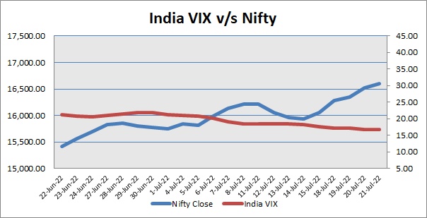 India Volatility Index (VIX), a gauge for market’s short-term expectation of volatility increased by 0.20% and reached 16.86. The 50 share Nifty up by 84.40 points or 0.51% to settle at 16,605.25.