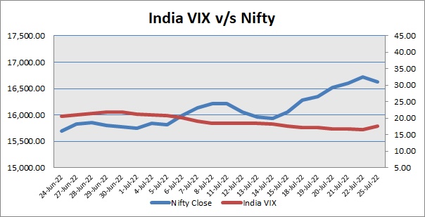 Nifty July 2022 futures closed at 16620.00 on Monday, at a discount of 11.00 points over spot closing of 16631.00, while Nifty August 2022 futures ended at 16634.85, at a premium of 3.85 points over spot closing. Nifty July futures saw a contraction of 9,254 units, taking the total open interest (Contracts) to 1,70,870 units. The near month derivatives contract will expire on July 28, 2022 (Provisional).