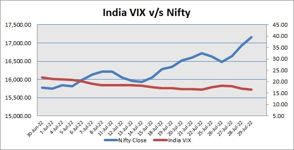 Nifty extended its upward rally for third day. Market made positive start, as the commerce ministry said the manufacturing sector attracted foreign direct investments worth $21.34 billion in 2021-22, an increase of 76 per cent year-on-year. Further, index extended its gains, as traders took support with RBI data showing that Bank credit rose by 12.89 per cent to Rs 122.81 lakh crore and deposits by 8.35 per cent to Rs 168.09 lakh crore in the fortnight ended July 15, 2022. Market continued its firm trade after private report stated that India received the highest aid for trade in 2020 at $2.7 billion from developed countries even as the receipts declined during the pandemic year compared to $3.9 billion received in 2019. The World Trade Organisation-led aid for trade flows is particularly meant for the least developed economies. It consists of official development support to build supply-side capacity and trade-related infrastructure to enable such countries to participate in international trade. In last leg of trade, market touched its intraday high point, as Union Minister for Agriculture and Farmers Welfare, Narendra Singh Tomar has said that the emphasis is being given on increasing farmers income under the leadership of Prime Minister Narendra Modi. Finally, Nifty closed the day’s trade above 17150 mark.