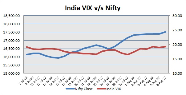Nifty ended higher for the second consecutive session on Monday. India VIX was up by 19.30%. After making cautious start, market added points to trade above neutral line, as Reserve Bank Governor Shaktikanta Das said that India is unlikely to be impacted by any adverse developments in Taiwan. The Governor said Taiwan accounts for only 0.7 per cent of India's overall trade and the capital flows from the island are also not very high. Index maintained its gains, as the Reserve Bank of India (RBI) data showed that India's foreign exchange (forex) reserves rose by $2.315 billion to $573.875 billion for the week ended July 29 on the back of robust capital inflows in the equities markets and strengthening of rupee from the record low. In afternoon trade, index enlarged its gains, as data with depositories showed after turning net buyers last month, foreign investors continued their positive stance on Indian equities and invested over Rs 14,000 crore in the first week of August amid softening of the dollar index. This was way higher than the net investment of nearly Rs 5,000 crore by Foreign Portfolio Investors (FPIs) in entire July. Finally, Nifty closed the day’s trade above 17500 mark.