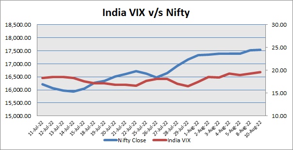 Nifty August 2022 futures closed at 17551.75 (LTP) on Wednesday, at a premium of 17 points over spot closing of 17534.75, while Nifty September 2022 futures ended at 17618.25 (LTP), at a premium of 83.50 points over spot closing. Nifty May futures saw an addition of 1,971 units, taking the total open interest (OI) to 2,18,285 units. The near month derivatives contract will expire on August 25, 2022 (Provisional).