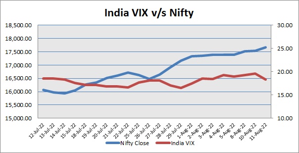 Nifty August 2022 futures closed at 17676.00 (LTP) on Thursday, at a premium of 17 points over spot closing of 17659.00, while Nifty September 2022 futures ended at 17746.00 (LTP), at a premium of 87.00 points over spot closing. Nifty May futures saw an addition of 3,729 units, taking the total open interest (OI) to 2,17,124 units. The near month derivatives contract will expire on August 25, 2022 (Provisional).