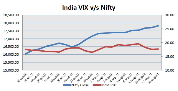 India Volatility Index (VIX), a gauge for market’s short-term expectation of volatility increased by 0.44% and reached 17.69. The 50 share Nifty up by 127.10 points or 0.72% to settle at 17,825.25.