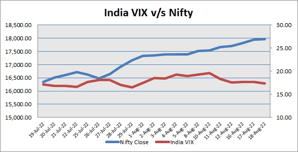 Nifty August 2022 futures closed at 18000.95 on Thursday, at a premium of 44.45 points over spot closing of 17956.50, while Nifty September 2022 futures ended at 18082.00, at a premium of 125.50 points over spot closing. Nifty August futures saw an addition of 3,824 units, taking the total open interest (Contracts) to 2,29,270 units. The near month derivatives contract will expire on August 25, 2022 (provisional).