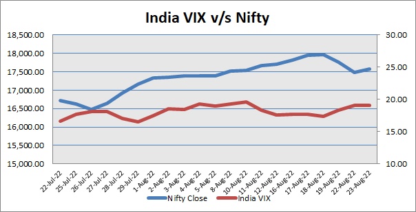 Nifty August 2022 futures closed at 17641.60 (LTP) on Tuesday, at a premium of 64.10 points over spot closing of 17577.50, while Nifty September 2022 futures ended at 17719.40 (LTP), at a premium of 141.90 points over spot closing. Nifty August futures saw an addition of 17,322 units, taking the total open interest (Contracts) to 1,94,531 units. The near month derivatives contract will expire on August 25, 2022 (Provisional).
