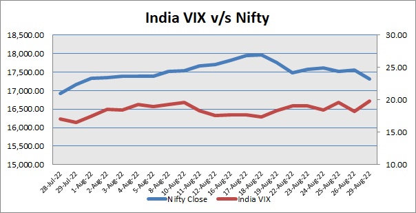 Nifty ended Monday’s session below 17350 mark amid weak global cues and huge selling pressure on IT stocks. Market made pessimistic start, as Reserve Bank of India (RBI) data showed that the country's foreign exchange reserves fell $6.687 billion to $564.053 billion in the week ended August 19. In the previous week ended August 12, the reserves declined $2.238 billion to $570.74 billion. Further, index extended its losses, as Reserve Bank of India (RBI) Deputy Governor Michael Debabrata Patra has said that in the near-term, inflation trajectory continues to be ‘heavily contingent’ upon the evolving geopolitical developments, international commodity prices and global financial sector developments.  Market continued its weak trade till the end, as US Federal Reserve Chair Jerome Powell’s signal that the central bank will raise interest rates further to battle inflation. Finally, Nifty closed the day’s trade over a percent.