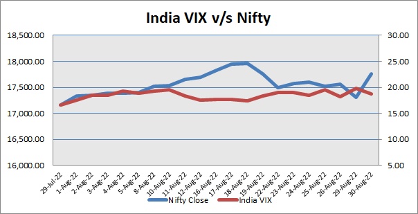 Nifty September 2022 futures closed at 17823.00 (LTP) on Tuesday, at a premium of 63.70 points over spot closing of 17759.30, while Nifty October 2022 futures ended at 17875.00 (LTP), at a premium of 115.70 points over spot closing. Nifty September futures saw an addition of 16,856 units, taking the total open interest (Contracts) to 2,38,355 units. The near month derivatives contract will expire on September 29, 2022 (Provisional).