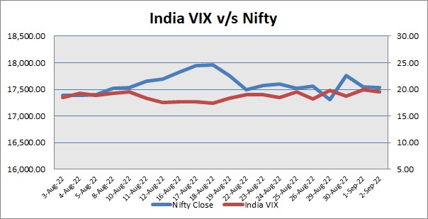 Nifty September 2022 futures closed at 17561.95 (LTP) on Friday, at a premium of 22.50 points over spot closing of 17539.45, while Nifty October 2022 futures ended at 17616.00 (LTP), at a premium of 76.55 points over spot closing. Nifty September futures saw an addition of 18,293 units, taking the total open interest (Contracts) to 2,72,663 units. The near month derivatives contract will expire on September 29, 2022 (Provisional).