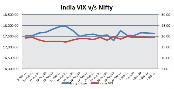 Nifty September 2022 futures closed at 17655.00 (LTP) on Wednesday, at a premium of 30.60 points over spot closing of 17624.40, while Nifty October 2022 futures ended at 17709.00 (LTP), at a premium of 84.60 points over spot closing. Nifty September futures saw an addition of 10,284 units, taking the total outstanding open interest (OI) to 2,66,824 units. The near month derivatives contract will expire on September 29, 2022 (Provisional).