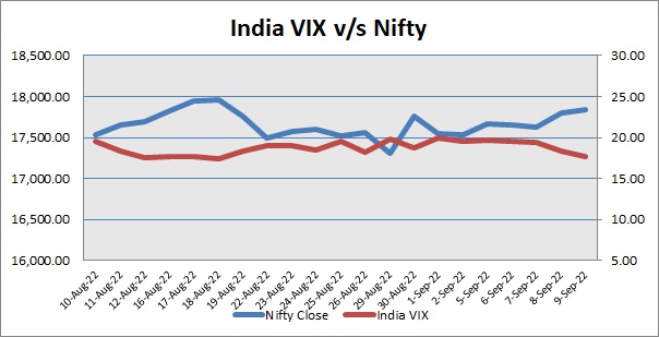 Nifty ended the Friday’s trade above 17800 mark. India VIX was down by 3.20%. Market made positive start with Finance Minister Nirmala Sitharaman's statement that India has ramped up the import of crude oil from Russia at discounted prices amid sanctions on Moscow as part of the country's inflation management. Further, market extended its gains, as Prime Minister Narendra Modi highlighted the efforts of the Central government for the welfare of the citizens, including the ones toward agriculture and rural households and said that it is the government's priority to support crores of farmers all across the nation at every step. However, in afternoon trade, index trimmed most of its gains, as the Centre for Monitoring Indian Economy said consumer sentiments in India deteriorated in August 2022 and in the first week of September, after having improved substantially in the previous month, with significant dip in urban sentiments. According to CMIE, the Index of Consumer Sentiments (ICS) shrunk by 0.5% in August, after having risen by an impressive 6.7% in July, and further by a 3.1% in the first week of September. But index managed to end session above neutral line.