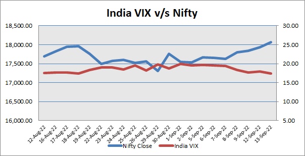 Nifty September 2022 futures closed at 18108.50 (LTP) on Tuesday, at a premium of 38.45 points over spot closing of 18070.05, while Nifty October 2022 futures ended at 18160.00 (LTP), at a premium of 89.95 points over spot closing. Nifty September futures saw an addition of 1,702 units, taking the total open interest (Contracts) to 2,55,209 units. The near month derivatives contract will expire on September 29, 2022 (Provisional).