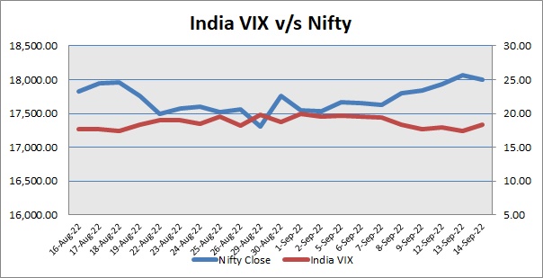 Nifty September 2022 futures closed at 18018.00 (LTP) on Wednesday, at a premium of 14.25 points over spot closing of 18003.75, while Nifty October 2022 futures ended at 18070.00 (LTP), at a premium of 66.25 points over spot closing. Nifty September futures saw an addition of 4,791 units, taking the total open interest (Contracts) to 2,56,791 units. The near month derivatives contract will expire on September 29, 2022 (Provisional).