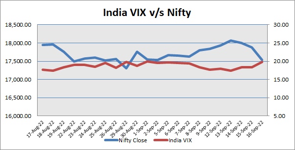 Nifty extended its southbound journey for third straight session and ended the day’s trade with cut of over one and half a percent. India VIX was up by 7.77%. Market started day on negative note, as India Ratings cut the forecast to 6.9 per cent from 7 per cent, joining other institutions who have cut their projections to below 7 per cent since the release of the April-June quarter GDP data. Further, index continued its weak trade, as International Monetary Fund (IMF) stated that the global economic outlook remains downbeat and some countries are expected to slip into recession in 2023, but it is too early to say if there will be a widespread global recession. The IMF in July revised down global growth to 3.2% in 2022 and 2.9% in 2023. It will release a new outlook next month. In late afternoon trade, index added more losses to touch intraday low point, as India Ratings (Ind-Ra) said that the current account deficit (CAD) may have reached a nine-year or 36-quarter high of 3.4 per cent of the gross domestic product (GDP) in the first quarter of this financial year against a surplus of 0.9 per cent a year ago. Finally, Nifty closed the Friday’s trade below 17550 mark.