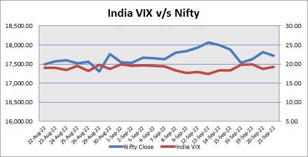 Nifty closed the Wednesday’ session with cut of above half a percent ahead of the US Federal Reserve's meeting outcome. India VIX was up by 2.80%. Market made negative start, as traders were cautious with chief economic advisor V Anantha Nageswaran’s statement that Indian economy will grow at over 7 per cent, down from above 8 per cent of growth rate projected in January. He, however, said that the economic momentum and the animal spirits are unmistakable. Index continued weak trade, as retail inflation for farm and rural workers increased to 6.94 per cent and 7.26 per cent, respectively, in August mainly due to higher prices of certain food items. In July, retail inflation for farm and rural workers stood at 6.60 per cent and 6.82 per cent respectively. In afternoon trade, market touched its intraday low point after Asian Development Bank (ADB) has slashed India's economic growth projection for 2022-23 to 7 per cent from 7.2 per cent earlier, citing higher than expected inflation and monetary tightening. However, market cut some of its losses but failed to erase all losses and finally ended the session below 17750 mark.