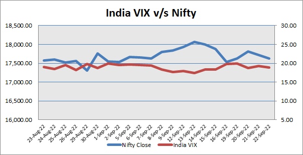 Nifty extended its losing streak on weekly F&O expiry day and closed the day’s trade with cut of half a percent. Market made negative start with private report stating that India's headline retail inflation is expected to rise to a five-month high of 7.4% in September, with the risk of going higher if the momentum of food and vegetable prices picks up further in the rest of the month. Further, Market added more losses to trade at lower level, as traders were cautious with report that foreign institutional investors (FIIs) have sold (net) shares worth Rs 461.04 crore on September 21, as per provisional data available on the NSE. In late afternoon trade, index trimmed most of its losses, as rating agency Crisil stated that gross non-performing assets (GNPAs) of banks - a key indicator of asset quality - is expected to improve 90 basis points (bps) to 5% this fiscal on-year (FY23), and another 100 bps to a decadal low of 4% by March 31, 2024 (FY24), riding on post-pandemic economic recovery and higher credit growth. But, market unable to erase all losses and once again came under selling pressure at the end of the session.