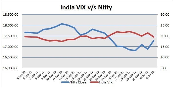 India Volatility Index (VIX), a gauge for market’s short-term expectation of volatility decreased by 8.40% and reached 19.57. The 50 share Nifty up by 386.95 points or 2.29% to settle at 17,274.30.