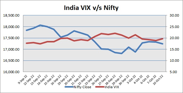 Nifty ended Monday’s session lower with settling below the psychological 17250 levels. India VIX was up by 4.30%. Market made negative start after Reserve Bank of India's (RBI) weekly statistical supplement showed that India's foreign exchange reserves fell to $532.66 billion in the week through Sept. 30, their lowest level since July 2020. Further, index continued its downward trade even after Economic Advisory Council to the Prime Minister (EAC-PM) member Sanjeev Sanyal said that India will perhaps emerge as the strongest major economy with 7 per cent growth rate in FY23, amid fears of the world slipping into recession. However, market trimmed most of its losses in afternoon trade with Central Board of Direct Taxes’ (CBDT) statement that gross collection of tax on corporate and individual earnings jumped nearly 24 percent so far in the current fiscal year that started on April 1, 2022. But market unable to erase all losses and finally ended the session in red territory, as Indian rupee continued to depreciate against the US dollar due to elevated crude oil prices.