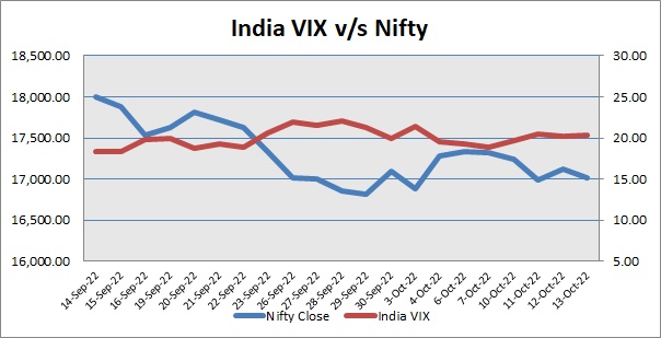 S&P CNX Nifty resumed southward journey on Thursday amid weekly F&O expiry. India VIX was up by 0.57%. Market made negative start, as trader were cautious after India's retail inflation spiked to 7.41% in September, mainly due to costlier food items. For the ninth month in a row, retail inflation has remained above the Reserve Bank of India's tolerance level of 6%. Index extended its losses to trade lower, as India's industrial growth, as per the Index of Industrial Production (IIP), slid to an 18-month low of -0.8% in August from 2.2% in July. Globally, investor await the data on U.S. consumer price inflation later in the day. Sentiment weakened in afternoon trade, as rating agency Crisil's research wing in its latest report stated that India Inc is likely to report a three per cent year-on-year fall in profits for the July-September period (Q2FY23). This fall in profitability will be the fourth straight quarter of the decline in profits for the listed companies. Profitability is seen declining 300 basis points (bps) due to elevated commodity prices.