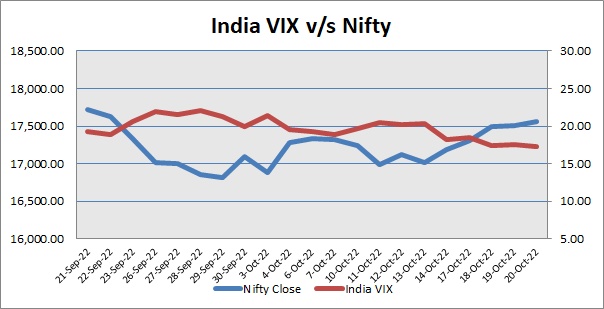S&P CNX -- Nifty managed to end session in positive territory on Thursday, extending its gains for fifth straight day. India VIX was down by 1.45%. Index made negative start, as traders got cautious after rupee opened at record low of 83.05 against the US dollar from its previous close of 83.00 on Wednesday. Besides, foreign institutional investors (FIIs) net offloaded shares worth Rs 453.91 crore on Wednesday (October 19), according to the provisional data available on the NSE. Further, index continued to trade lower as private report stated that India's economy will grow well below its potential over the next two years, with inflation staying above the mid-point of the Reserve Bank of India's tolerance band despite recent interest rate rises. Moreover, higher treasury yields continued jitters over sharp rate hikes by the Federal Reserve.
