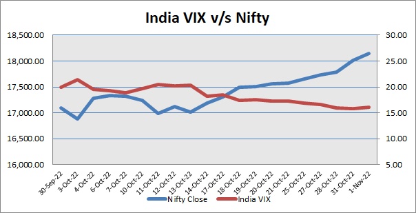 Nifty November 2022 futures closed at 18215.00 (LTP) on Tuesday, at a premium of 69.60 points over spot closing of 18145.40, while Nifty December 2022 futures ended at 18277.20 (LTP), at a premium of 131.80 points over spot closing. Nifty November futures saw an addition of 18,461 units, taking the total open interest (Contracts) to 2,52,724 units. The near month derivatives contract will expire on November 24, 2022. (Provisional)