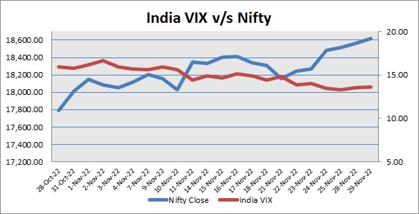 India Volatility Index (VIX), a gauge for market’s short-term expectation of volatility increased by 0.36% and reached 13.62. The 50 share Nifty up by 55.30 points or 0.30% to settle at 18,618.05.