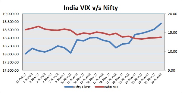 India Volatility Index (VIX), a gauge for market’s short-term expectation of volatility increased by 1.41% and reached 13.81. The 50 share Nifty up by 140.30 points or 0.75% to settle at 18,758.35.