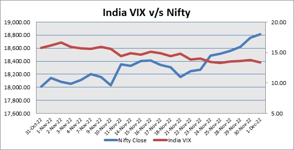 Continuing its upward journey for the eighth consecutive session, S&P CNX Nifty closed Thursday’s trade above 18800 mark amid weekly F&O expiry. India VIX was down by 3.24%. It was a strong start for Nifty, as traders got encouragement after government data showed that retail inflation for industrial workers rose to 6.08 per cent in October from 6.49 per cent in September 2022 mainly due to lower prices of certain food items. Local investors also got cheered with Chief Economic Advsior V Anantha Nageswaran’s statement that the Indian economy is on track to achieve a 6.8-7 per cent GDP growth in the current fiscal. He said the economic recovery momentum is continuing and the GDP is averaging the 2019-20 level.