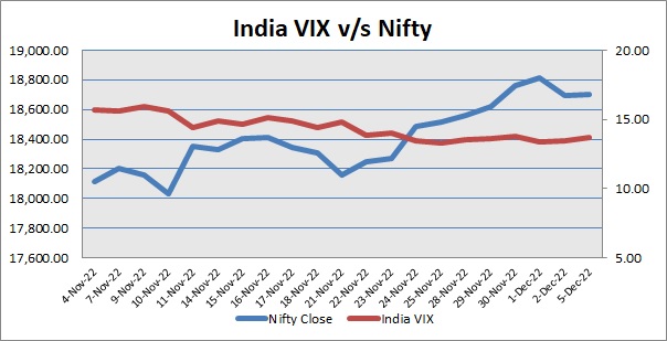 Among, Nifty calls, 18800 SP from the December month expiry was the most active call with a contraction of 1,803 units open interests. Among Nifty puts, 18700 SP from the December month expiry was the most active put with an addition of 3,671 units open interests. The maximum OI outstanding for Calls was at 19000 SP (68,912 units) and that for Puts was at 18000 SP (69,878 units). The respective Support and Resistance levels of Nifty are: Resistance 18755.98 -- Pivot Point 18673.66 -- Support -- 18618.73.