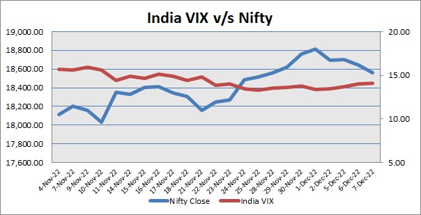 India Volatility Index (VIX), a gauge for market’s short-term expectation of volatility increased by 0.24% and reached 14.08. The 50 share Nifty down by 82.25 points or 0.44% to settle at 18,560.50.