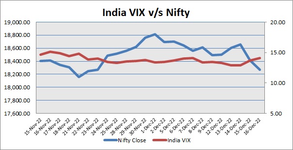 India Volatility Index (VIX), a gauge for market’s short-term expectation of volatility increased by 2.45% and reached 14.07. The 50 share Nifty down by 145.90 points or 0.79% to settle at 18,269.00.