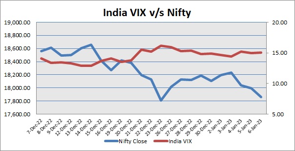 Nifty January 2023 futures closed at 17949.05 (LTP) on Friday, at a premium of 89.60 points over spot closing of 17859.45, while Nifty February 2023 futures ended at 18015.00 (LTP), at a premium of 155.55 points over spot closing. Nifty January futures saw an addition of 26,373 units, taking the total open interest (Contracts) to 12,49,525 units. The near month derivatives contract will expire on January 25, 2023. (Provisional)