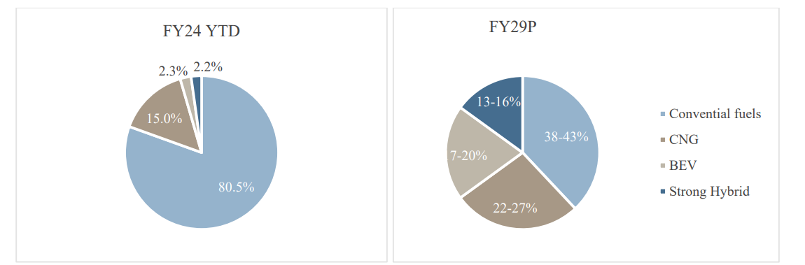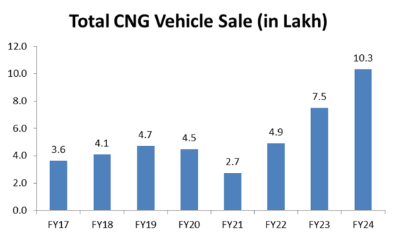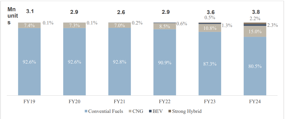 The share of CNG variants in passenger vehicle expanded from 7.4% in FY19 to 15% by FY24.