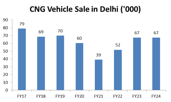 Delhi being early adopter of CNG infrastructure saw significant CNG vehicle penetration during 2017-18 period due to ban on diesel vehicles. Sales peaked at 79,000 units in FY17 and have since stabilized around 67,000 units in FY24. This trend indicates that while Delhi's market for CNG vehicles is reaching saturation, the overall CNG fleet continues to grow at a moderate pace. Future growth opportunities for CNG vehicle sales are expected to come from less penetrated regions, particularly in Uttar Pradesh, where CNG infrastructure is still developing.