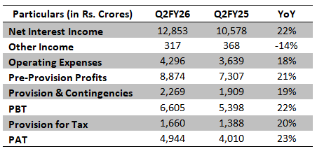• Provisions and contingencies rose 19% YoY to Rs.2,269 crore from Rs.1,909 crore, primarily due to higher provisioning in the MSME segment.